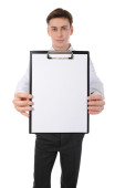 młody biznesmen posiadający biały znakiem karton z lato podczas wstawania