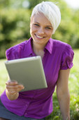 bliska portret piękny uśmiech, młoda dziewczyna z tabletem