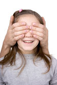 dziewczynka zaglądające przez strony z jednym okiem na białym tle nad białym
