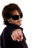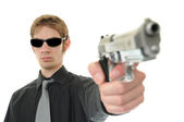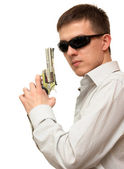 młody dorosły trzyma widza w muszce. na białym tle.