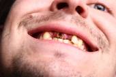 ohydne potworny człowiek patrzy w kamerę z szeroko otwartymi oczami, żółte zęby krzywe z nawiasy klamrowe i ogromny nos. eww! brzydkie.