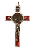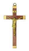drewniany krucyfiks z inri litery wyryte na górze na białym tle