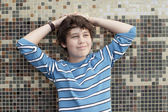 ponętna patrząc z rękoma za głową, zrelaksowany na białym tle.