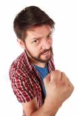 młody człowiek dorosły nastoletnich grozi jego zaciśniętej pięści. strony jest selektywnie w centrum uwagi. na białym tle