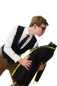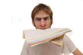 płacz młody biznes dorosły człowiek posiada jego teczki swoje zamiary, przestraszony z jego umysł w przerażenie. na białym tle.
