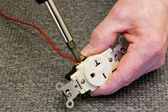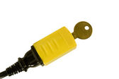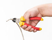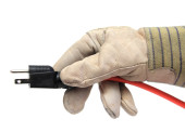 rękawiczkach dłoń trzymająca mężczyzna koniec zasilający na białym tle ze ścieżką przycinającą w tym rozmiarze