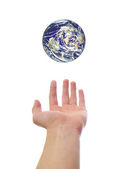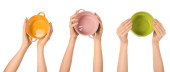 ramię i ręka trzyma z tworzywa sztucznego mleka dzbanek kartonów na białym tle na białym tle z pokoju dla tekstu.