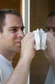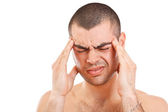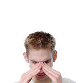 młody człowiek dorosły, podkreślił. On rubs jego oczy w bólu. na białym tle. czerwona plama na czole reprezentuje jego ból.