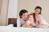 Azjatycka rodzina z dwójką dzieci odpoczywających na łóżku i ojcem czytającym na głos ciekawą książkę