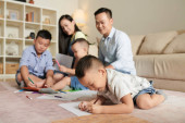 Zdjęcie "Azjatycka rodzina z dwójką dzieci odpoczywających na łóżku i ojcem czytającym na głos ciekawą książkę" może być wykorzystywane do celów osobistych i komercyjnych zgodnie z warunkami zakupionej licencji Royalty-free. Obraz jest dostępny do pobrania w jakości wysokiej rozdzielczości do 5760x3840.
