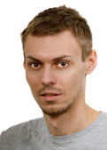 młody mężczyzna nastolatek smirks podczas wpatrując się w przestrzeń. na białym tle na białym tle z pokoju dla tekstu