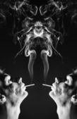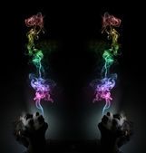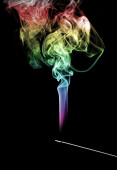 dym, zbliża się z Pałka kadzidła na czarnym tle z dość tęcza kolorów multi na opary