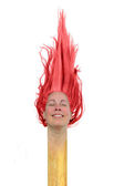 kobieta z czerwonym farbowane włosy jak płomień z głową na patyku mecz na białym tle