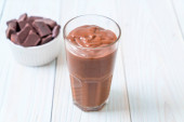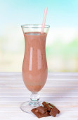 mleko czekoladowe w szkle, na drewnianym stole, na jasnym tle