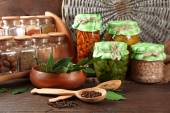 Zioła i herbaty i miodu w słoikach na drewnianym stole, na jasnym tle