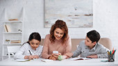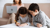 Matka wspiera dzieci piszące na notatnikach podczas pracy domowej