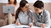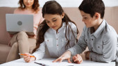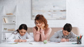 Kobieta siedząca obok dzieci pisząca na notatnikach podczas nauki w domu
