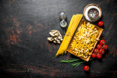 Zdjęcie "Tradycyjne włoskie tło żywności z pomidorami spaghetti oliwki z serem i oliwą na ciemnym tle. Sztandar" może być wykorzystywane do celów osobistych i komercyjnych zgodnie z warunkami zakupionej licencji Royalty-free. Obraz jest dostępny do pobrania w jakości wysokiej rozdzielczości do 5760x3840.