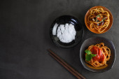 Zdjęcie "Makaron azjatycki z krewetkami i warzywami serwowane w misce na ciemnym tle. " może być wykorzystywane do celów osobistych i komercyjnych zgodnie z warunkami zakupionej licencji Royalty-free. Obraz jest dostępny do pobrania w jakości wysokiej rozdzielczości do 5760x3840.