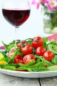 Zielona sałata rukola, pomidory, ser mozzarella kulki i sezamu na talerzu, na stole, na jasnym tle