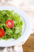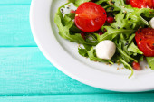 Zielona sałatka z rukolą, pomidory i sezamu na talerzu, na tle drewniane