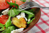 Zielona sałata rukola, pomidory, ser mozzarella kulki i sezamu na talerzu, drewniane tła kolor