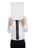człowiek w garniturze prążki trzyma zielony twarda okładka książki na białym tle biały jako jego głową