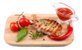 grillowany stek z przypraw, ziół i warzyw na desce, na białym tle