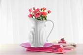 bukiet kolorowych tulipanów w wiklinowym koszu, na krześle, na tle wnętrz domu