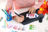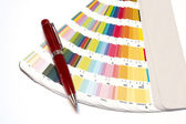 projekt graficzny i kolorowe próbki i pióra na biurku