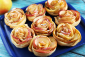 smaczne ciasto francuskie z jabłkami w kształcie róż na tabliczce na stół szczegół