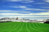 zielone pole świeżo ścięte z trawnika wiersze zawierające. błękitne niebo i zielone trawy z góry pomiędzy.