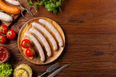 Płaska kompozycja świecka z wegetariańskimi kiełbaskami i warzywami na drewnianym stole. Miejsce na tekst