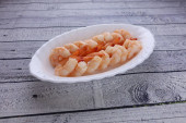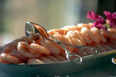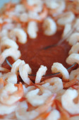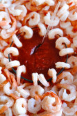 kilka krewetek, ułożone w misce z czerwonym sosem słodko do kąpieli.