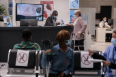 Biznes kobieta z maską twarzy dotykając łokcia, aby zapobiec zakażeniu koronawirusem