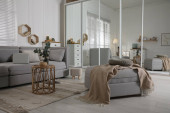 Przytulne wnętrza pokoju dziennego z dużą, szarą sofą