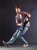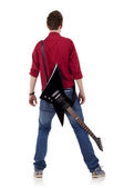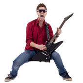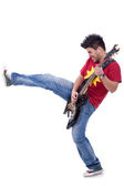 Zdjęcie z gwiazdą rocka, grając na gitarze, na białym tle