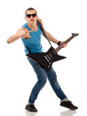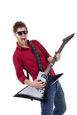 sławny muzyk z gitara śpiew z pasją, na białym tle
