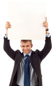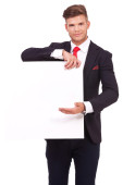 młody biznesmen Dokonywanie prezentacji i trzymając deskę biały