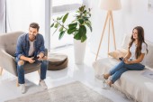 Młoda, niezadowolona brunetka przechodząca ramionami przez klatkę piersiową, siedząca na kanapie w salonie przeciwko swemu zamyślonemu lub obrażonemu mężowi