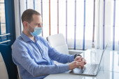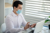 Zdjęcie "Młody kreatywny projektant w masce ochronnej patrząc na ekran komputera podczas pracy nad nową stroną internetową w biurze" może być wykorzystywane do celów osobistych i komercyjnych zgodnie z warunkami zakupionej licencji Royalty-free. Obraz jest dostępny do pobrania w jakości wysokiej rozdzielczości do 5760x3840.