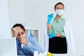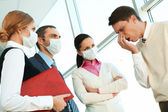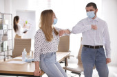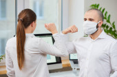 Dwóch młodych, eleganckich księgowych w maskach ochronnych omawiających dokument finansowy z diagramami i wykresami na spotkaniu roboczym w biurze