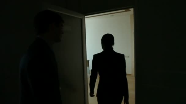 Młoda bizneswoman zombie stojąca przed kamerą na tle biurka z monitorami komputerowymi i martwym kolegą