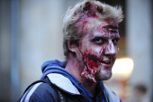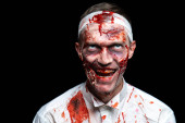 Straszny męski zombie z maską ochronną na brodzie i pogniecionym ubraniem formalnym patrząc na ciebie dąsając się przed kamerą