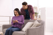 Zdjęcie "Szczęśliwy młody mężczyzna i kobieta w stroju casualwear patrząc na swoich ekranach smartfonów siedząc blisko siebie na kanapie przed telewizorem" może być wykorzystywane do celów osobistych i komercyjnych zgodnie z warunkami zakupionej licencji Royalty-free. Obraz jest dostępny do pobrania w jakości wysokiej rozdzielczości do 5760x3840.