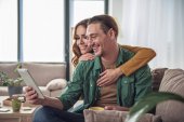 Szczęśliwy młody mężczyzna i kobieta w stroju casualwear patrząc na swoich ekranach smartfonów siedząc blisko siebie na kanapie przed telewizorem