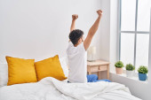 Zdjęcie "Szczęśliwy młody człowiek wyciągając ramiona w górę siedząc rano na dużym wygodnym podwójnym łóżku pod białym kocem" może być wykorzystywane do celów osobistych i komercyjnych zgodnie z warunkami zakupionej licencji Royalty-free. Obraz jest dostępny do pobrania w jakości wysokiej rozdzielczości do 5760x3840.