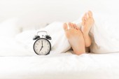 Szczęśliwy młody człowiek wyciągając ramiona w górę siedząc rano na dużym wygodnym podwójnym łóżku pod białym kocem