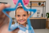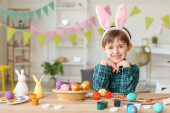 Happy little girl z opaską królika patrząc w aparat podczas siedzenia przy stole i malowania jaj w domu przed Wielkanocą