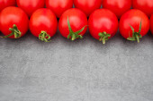 Czerwone świeże dojrzałe pomidory leżą na szarym tle.Koncepcja żywności. Zdrowa żywność, dojrzałe warzywa